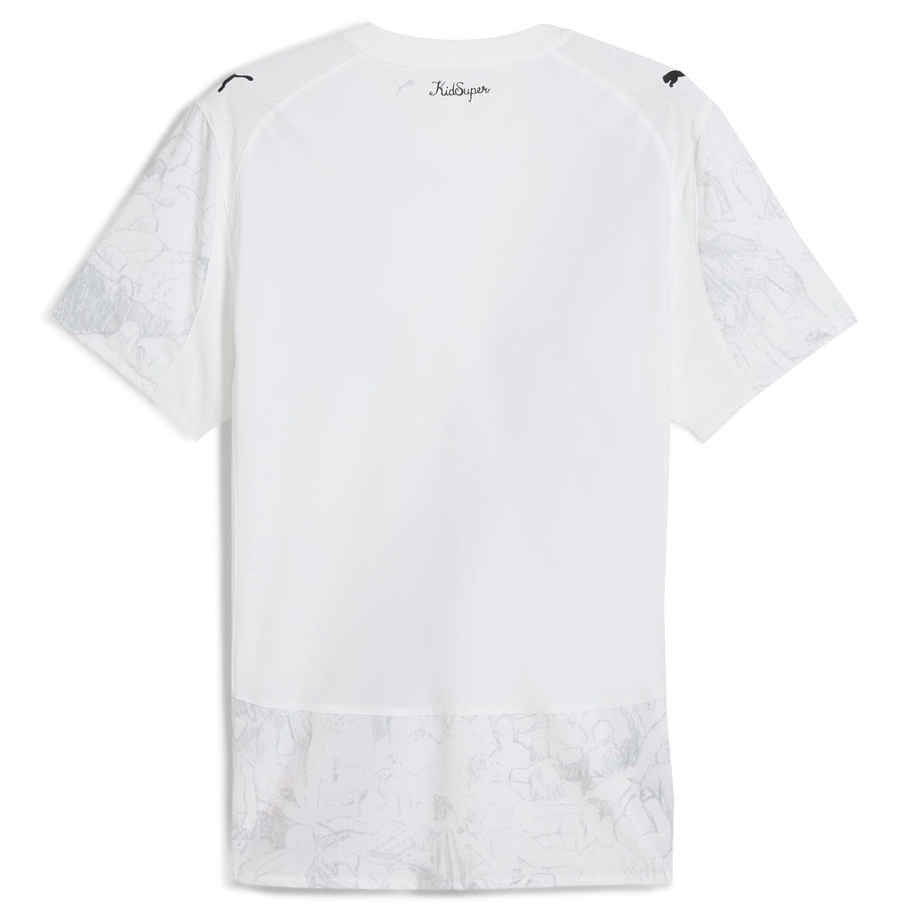The heat-sealed Manchester City crest on the chest and logo on the sleeve deliver authentic club branding, while the KidSuper logo at the back of the neck adds a unique design touch. This Shirt perfectly combines sustainability, style, and sport-ready technology for dedicated fans.