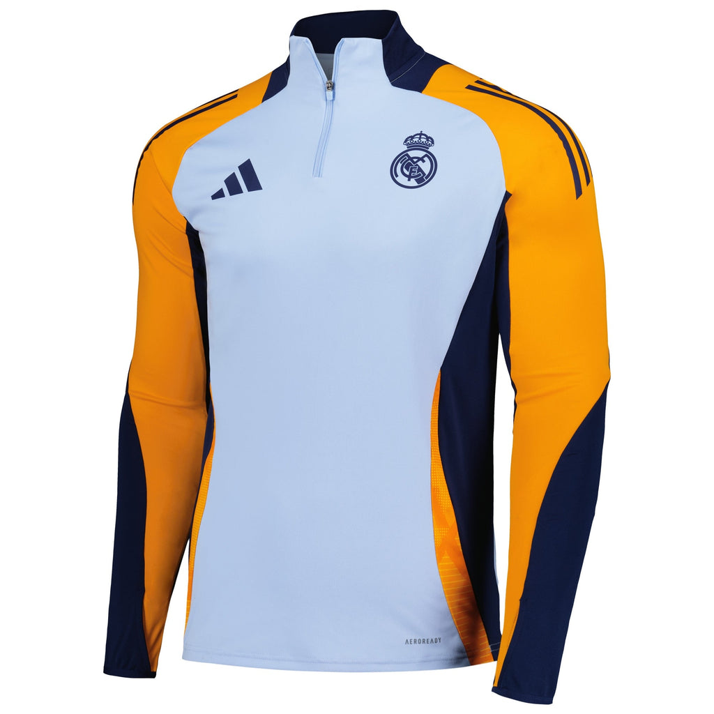 Lightweight and durable, this 2024/25 quarter-zip Training top from adidas is the ultimate on-pitch layering option. A bold, spirited Real Madrid design with signature team colors and graphics creates a dedicated look. The slim fit keeps things streamlined, raglan sleeves promote a natural range of motion and thumbholes help to enhance performance. As a bonus, integrated AEROREADY technology evaporates moisture for freshness.