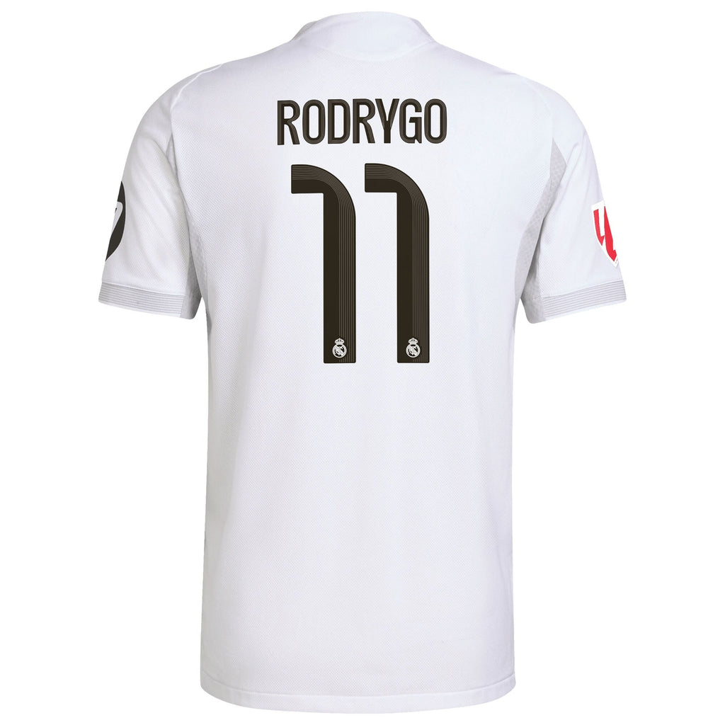 Show your unwavering support for Real Madrid and Rodrygo with this 2025/26 home Shirt in white. Engineered with AEROREADY® technology, this Shirt absorbs moisture to keep you dry and comfortable whether you’re on the pitch or cheering from the stands.